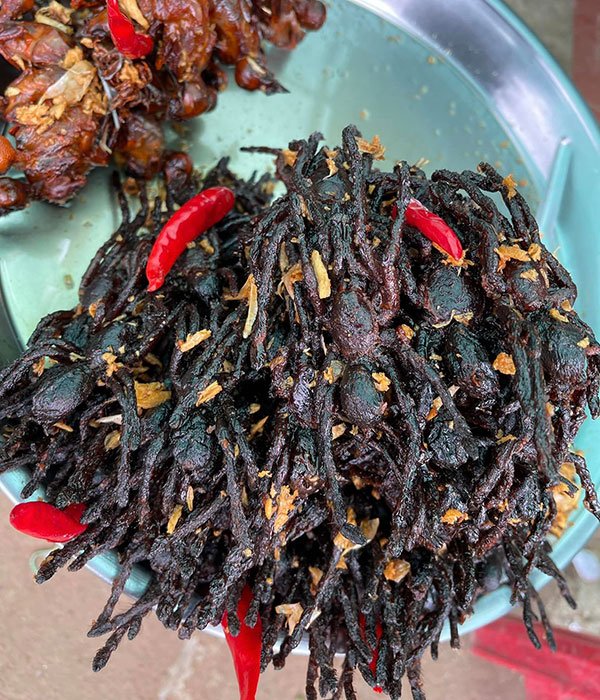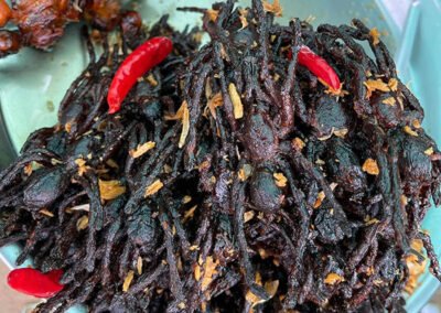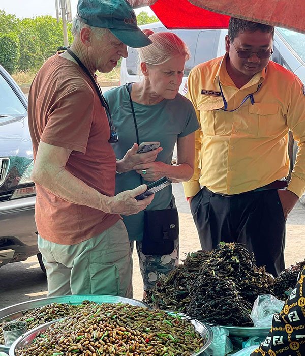 Next, on your Phnom Penh tour, you’ll travel by moto-rework (a Cambodian tuk-tuk) and head out of Phnom Penh on the Japanese Friendship Bridge before catching a ferry across the mighty Mekong River to Mekong Island. The island is famous for silk weaving, agriculture, and aquaculture (85% of residents earn their living from these industries). We’ll stop to see the silk weavers at work in the village, where you can purchase some of the local products if you wish. As you wander the village, you can explore a Buddhist temple and floating fish farms, see fields of rice and morning glory, and enjoy local Khmer snacks at a family home.